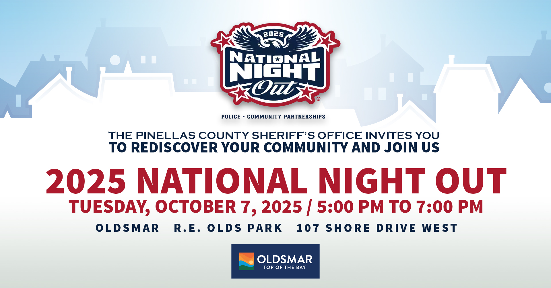 PINELLAS COUNTY – The Pinellas County Sheriff’s Office Annual National Night Out event is tonight, Tuesday, October 7, 2025, beginning at 5:00 p.m. and ending at 7:00 p.m. The event will take place at two different locations: Madeira Beach Recreation Center, located at 200 Rex Place, and R.E. Olds Park, located at 107 Shore Drive West in Oldsmar.